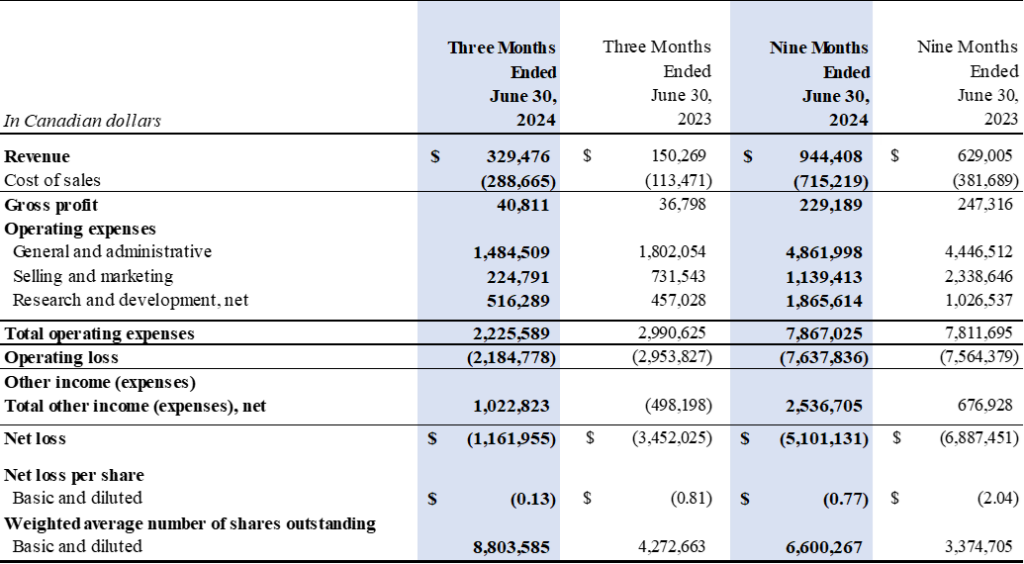 In Q3 and YTD Fiscal 2024, KWESST’s total revenue increased by $0.2 million and $0.3 million, respectively, and gross profit increased by 11% for the three-month period versus the comparable prior year period, and for YTD Fiscal 2024, we earned $0.2 million or gross margin of 24%, compared to $0.2 million or gross margin of 39% in the same prior period. The increase in Q3 revenue was mainly due to the ongoing DSEF government contract with our industry partners. KWESST’s Q3 operating loss decreased by 26% compared to the prior year period mainly due to a decrease in G&A and marketing spending, whereas its YTD Fiscal 2024 operating loss increased by 1% compared to the prior year period mainly due to increased research and development costs and personnel costs offset by a decrease in sales and marketing expenses.